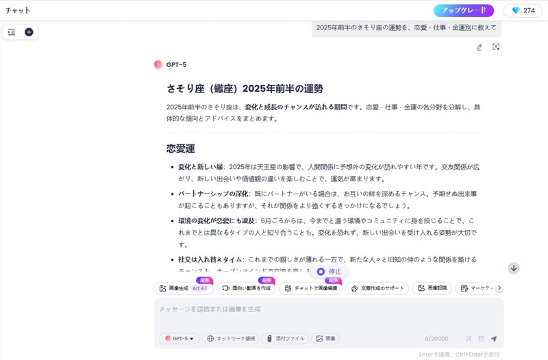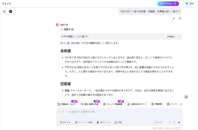 - 多機能:AIチャット、占い、文章生成、画像生成、動画生成などを1つのAIツールで完結